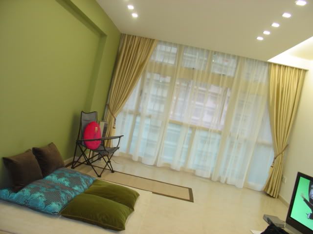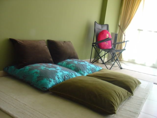 this is now my new makeshift living room - until the sofa set comes. mrs izad must be happy now that there is no more tikar mengkuang to cramp her style (and her butt). :p it's reminiscent of a bachelor pad, but we like it. empok dan gebu. benda lain tak penting. haha.